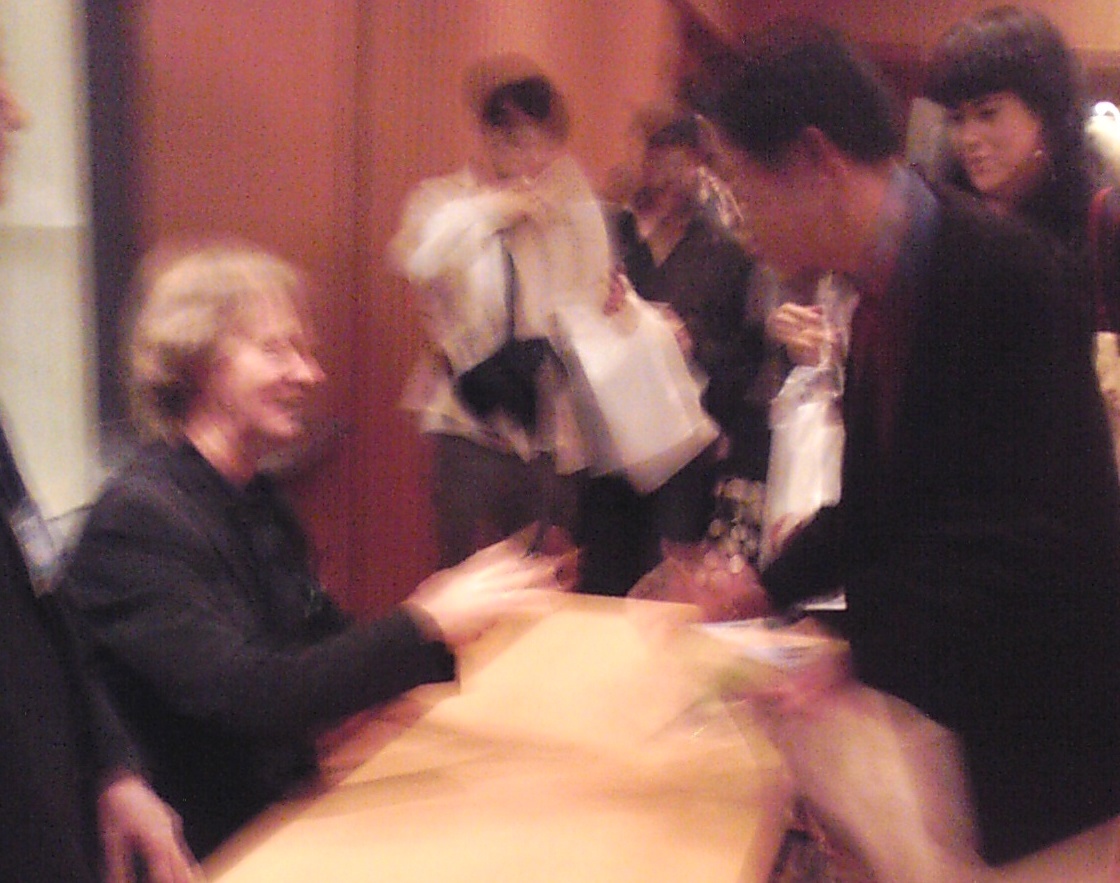 下の写真はCDにサインをしてもらった後、ラッセルと握手をするところですが、デジカメを持って行くのを忘れて、携帯のカメラで撮ったため、ブレまくって、ラッセルさんの顔も私の顔もよく分かりません。