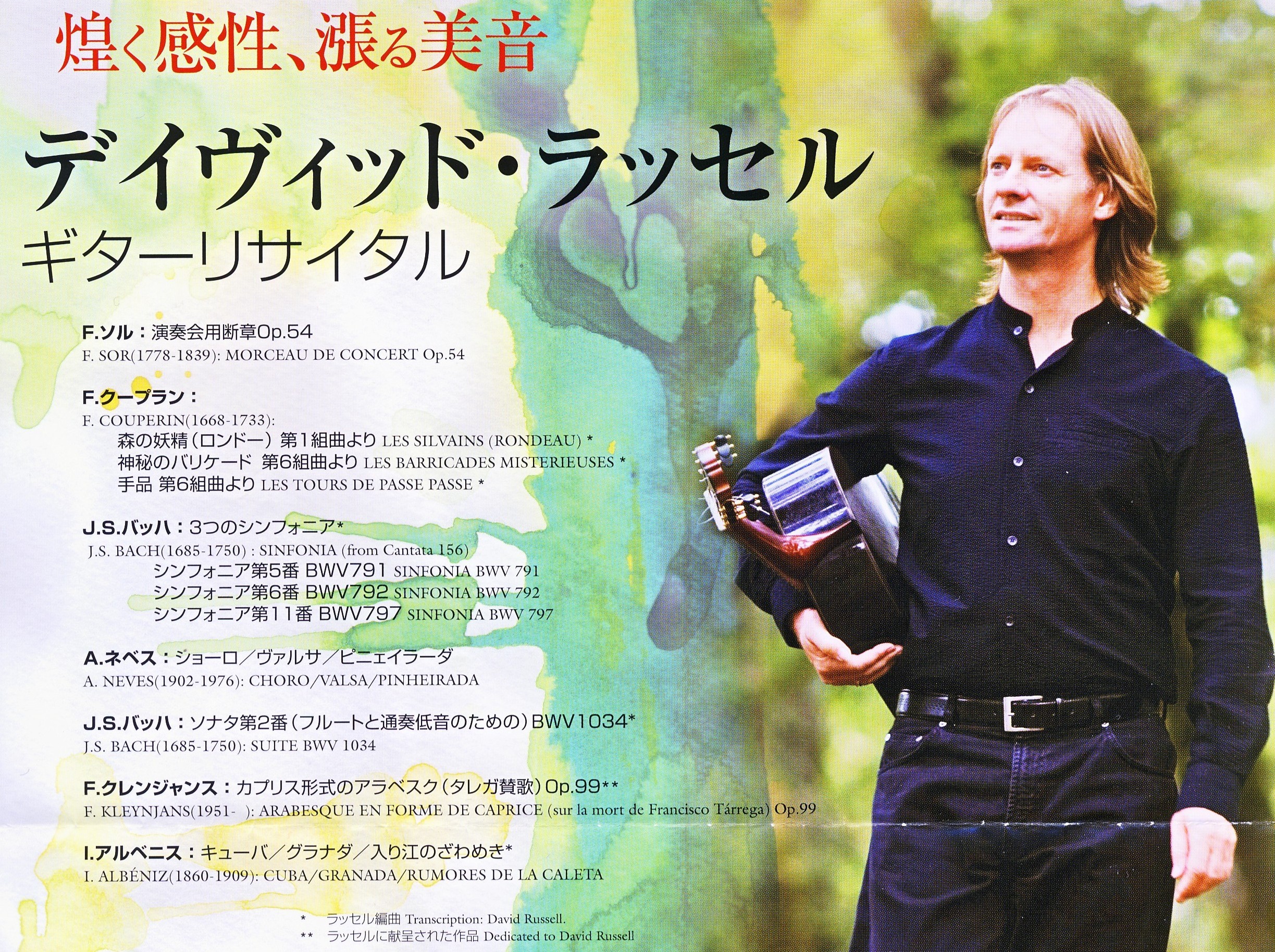 私はデイヴィッド・ラッセル(David Russell;1953年生まれ)のCD「タレガ全集」(Francisco Tarrega - Integral de Guitarra)を持っていますが、これは私のお気に入りで、繰り返し何回も聴いています。ラッセルの透明度の高い、安定した美しい音色、精確なテクニック、上品な情感あふれる表現、これらはずば抜けていると私は思います。ラッセルが来日して、リサイタルをやる予定だと1年近く前から聞いていましたので、必ず聴きに行こうと思っていました。