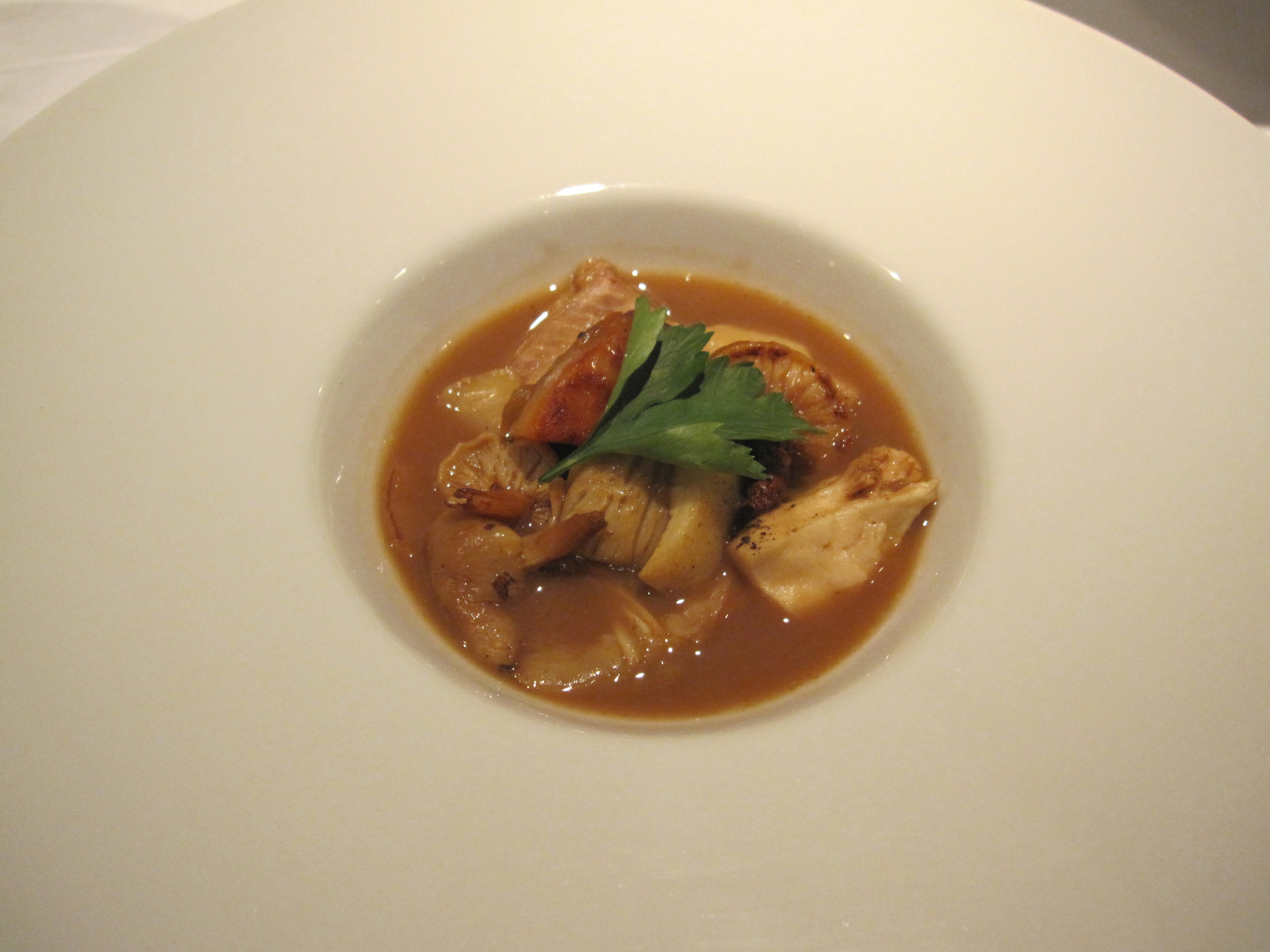 前菜は私も家内も魚介類のスープを注文しました(上の写真)。これはカニなど、いろいろな味が煮込まれていて美味しかったです。