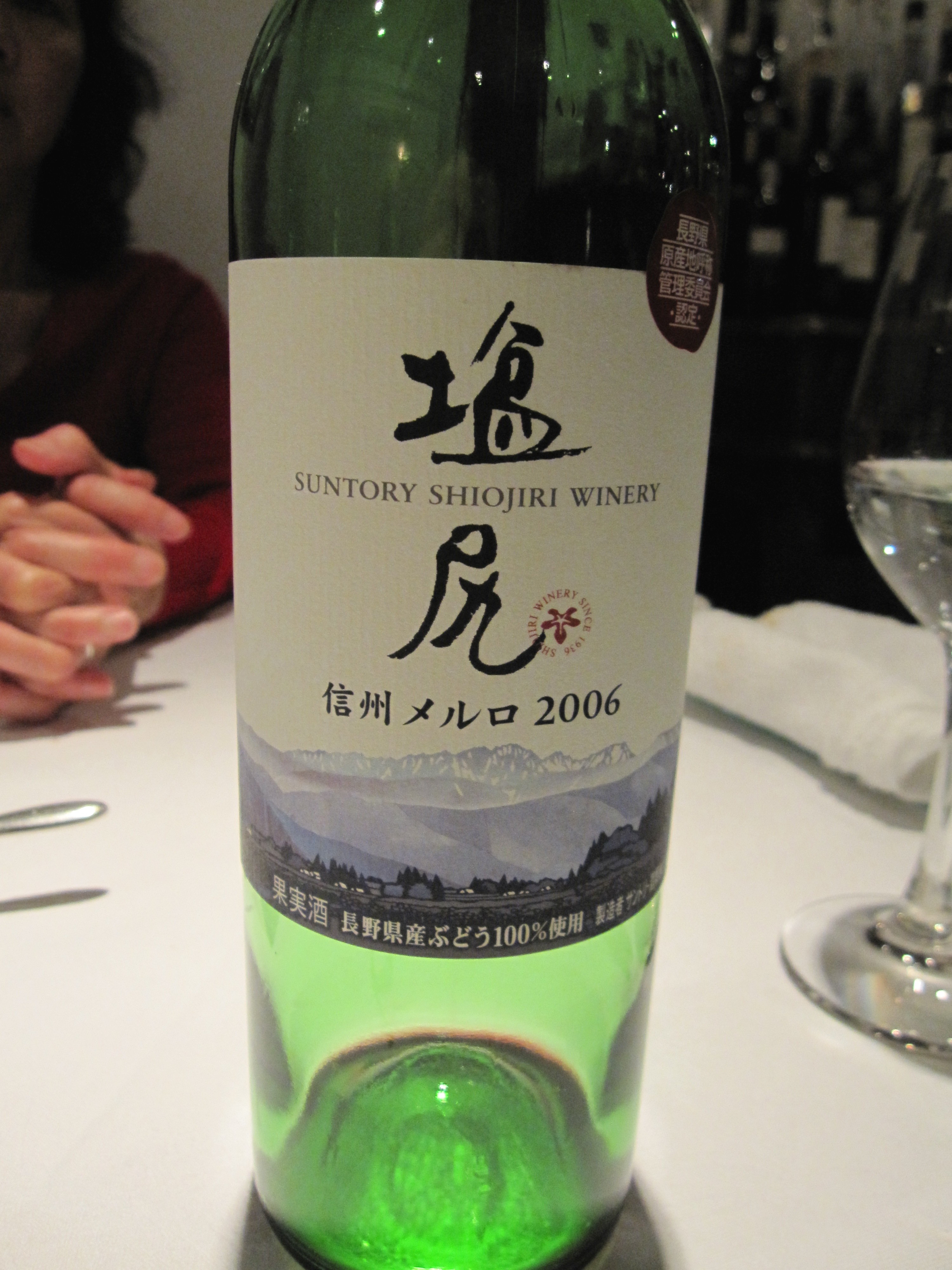私はグラスワイン2杯目に国産の塩尻信州メルロ2006をたのみました。 一杯目のフランスワインよりもちょっと渋めでしたが、どちらもいい味でした。