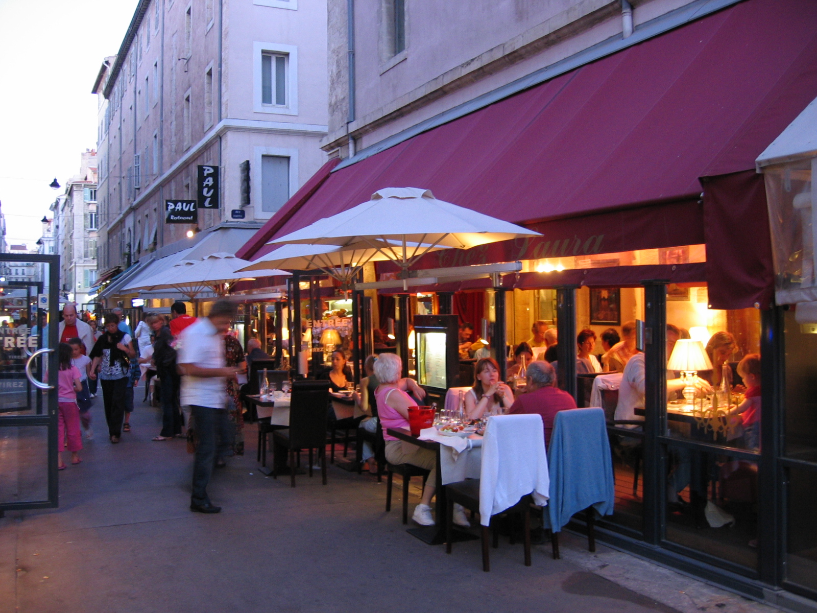 その日の夕食のために、泊っていたホテルのレセプションの女性に「ブイヤベースの美味しい手頃なレストランはないか?」聞いたところ、レストランLe Pavillon(下の写真)を紹介してくれました。Le Pavillonは旧港南側のレストランが集まった広場、Place Thiarsにありました。