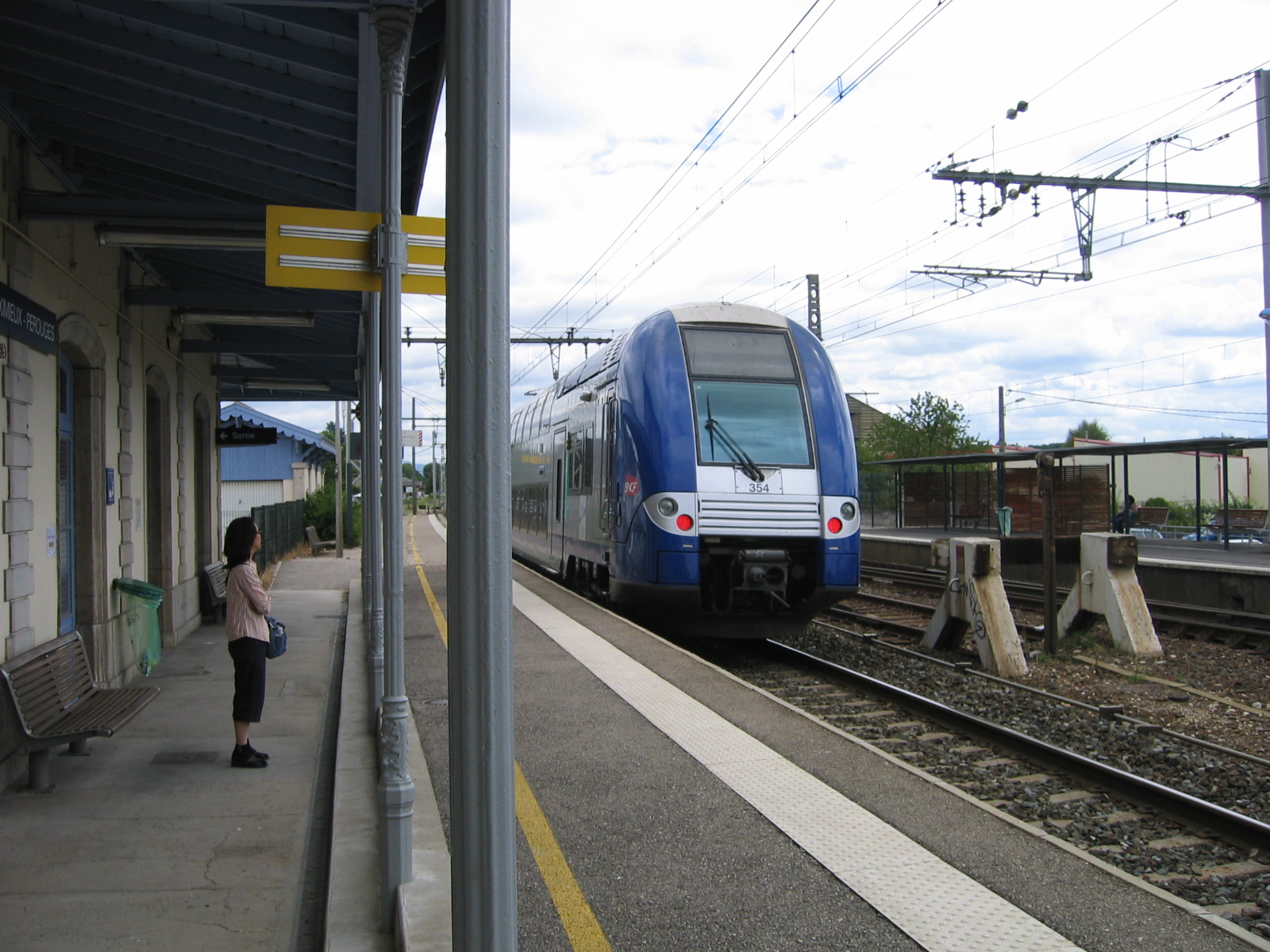 泊っていたホテルはペルーシュ駅のすぐそばですので、ペルーシュ駅からパール・デュー駅まで特急TGVに約10分間乗り、パール・デュー駅で在来線terに乗り換えて、約30分でメクシミュー・ペルージュMeximieux-Perouges駅に着きました。駅から約2キロを歩いて、小さな丘の上にある城壁の町、ペルージュに着きました。