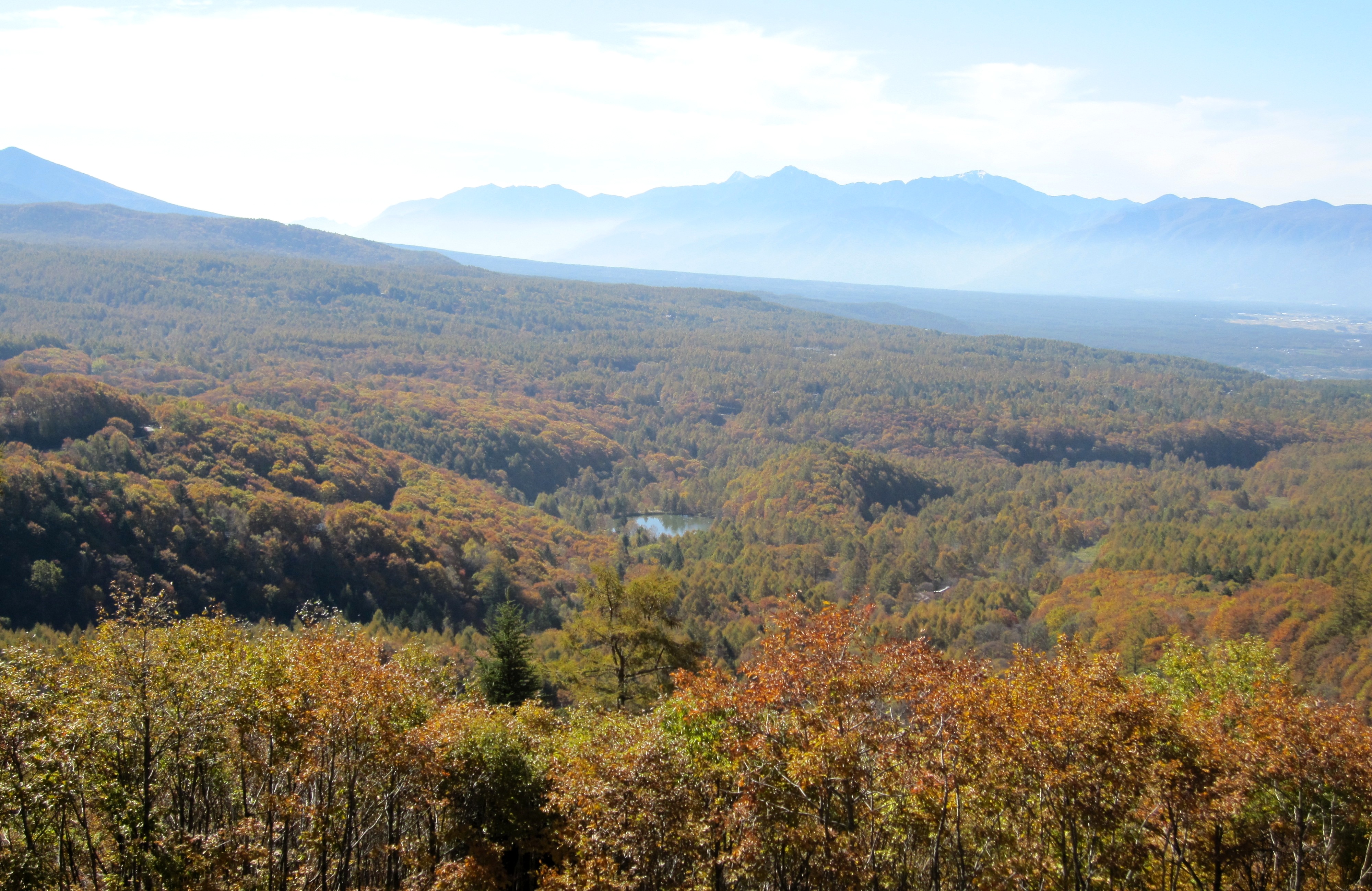 下の写真はビーナスライン沿い標高1,700mの所にある「蓼科女の神展望台」から見た蓼科高原別荘地です。その向こうには甲斐駒ケ岳などの南アルプスと、その右に入笠山がかすかに眺められます。
