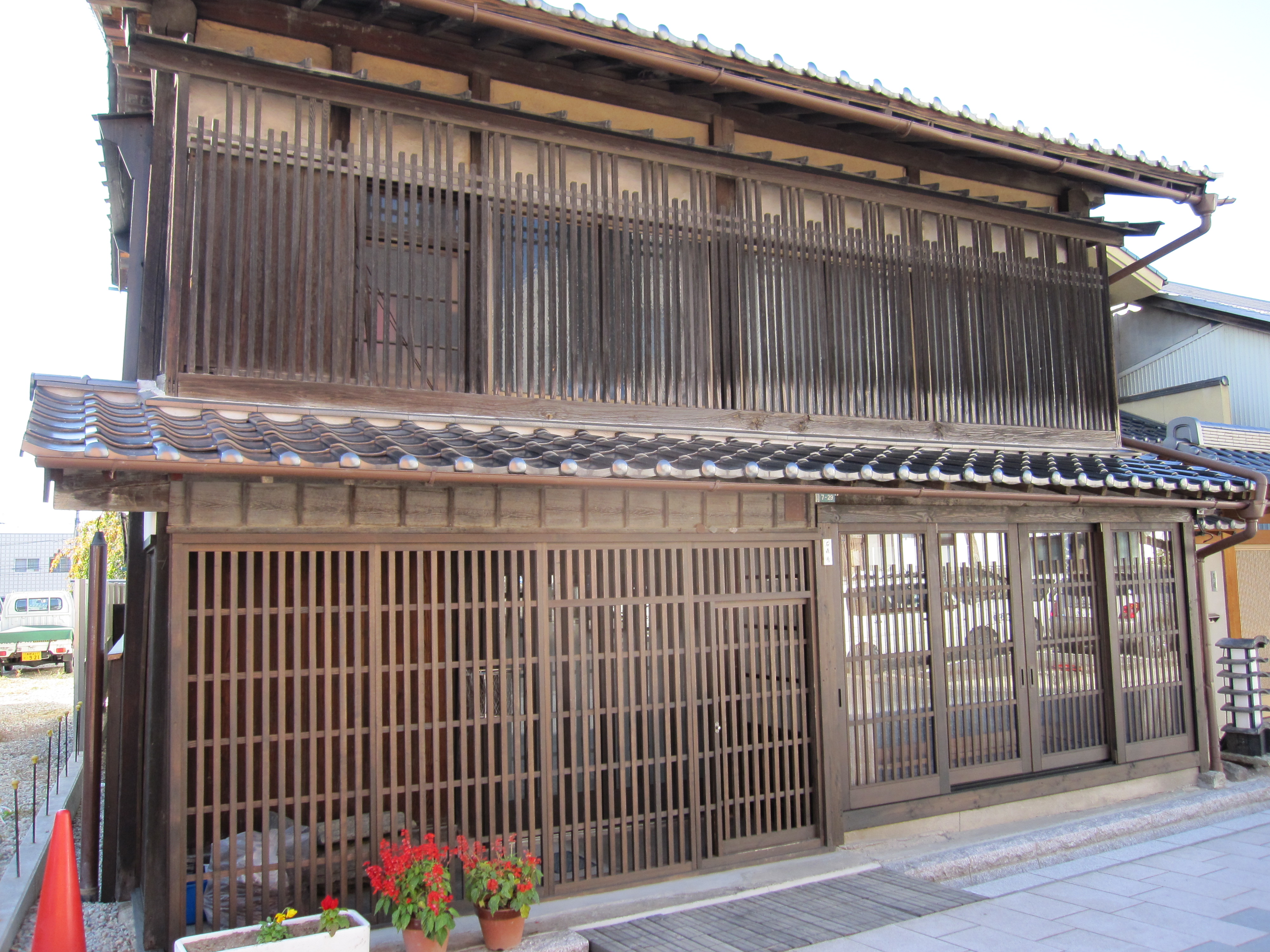 今でも柳の木がある柳町(やなぎまち)には古い家並みが多く残っています。もともと旅籠屋、呉服屋などの商家が多かったそうです。江戸末から明治にかけての町屋には2階に特徴ある「親付き切り子格子 」が付いています(下の写真)。