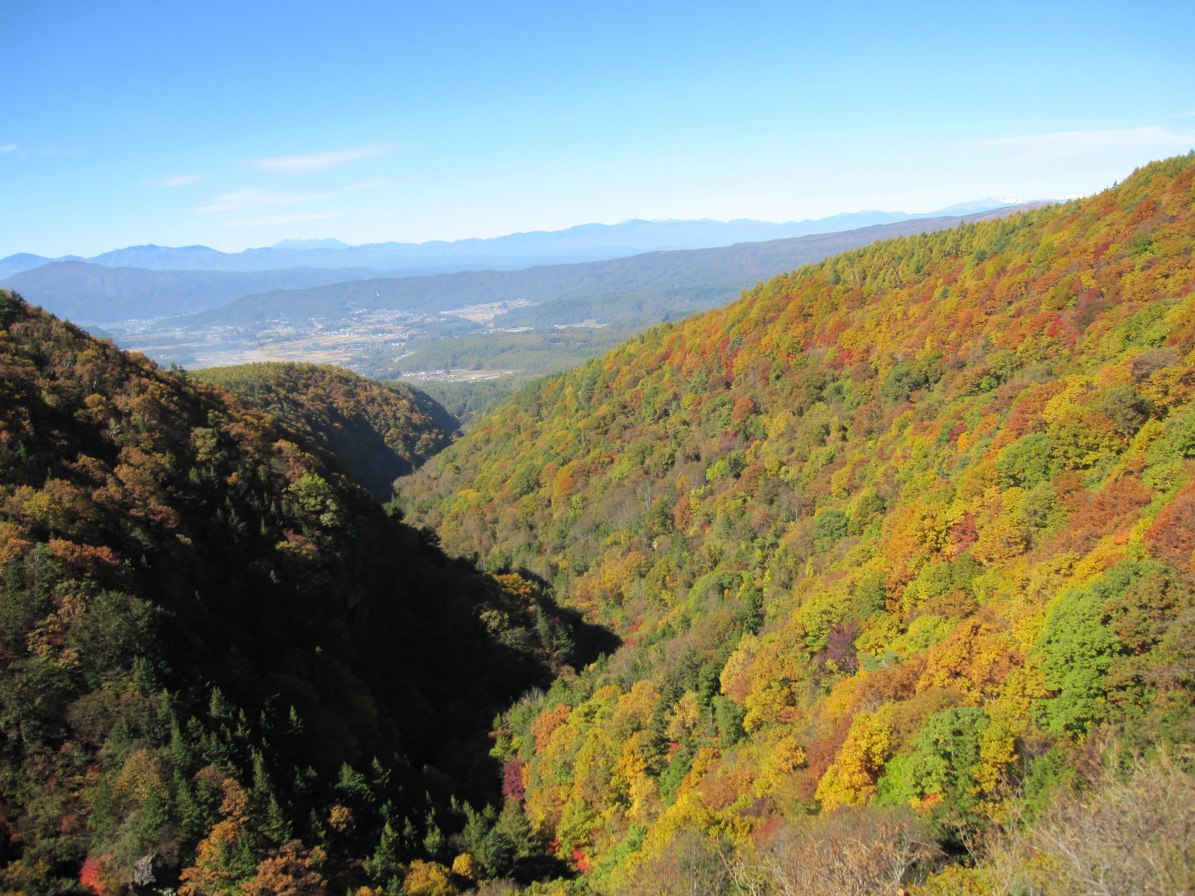 横谷峡の向こうには茅野市街が眺められ、そのはるか向こうには、左側に台形をした木曾御嶽山、その右に乗鞍岳、北アルプスがきれいに見えました。