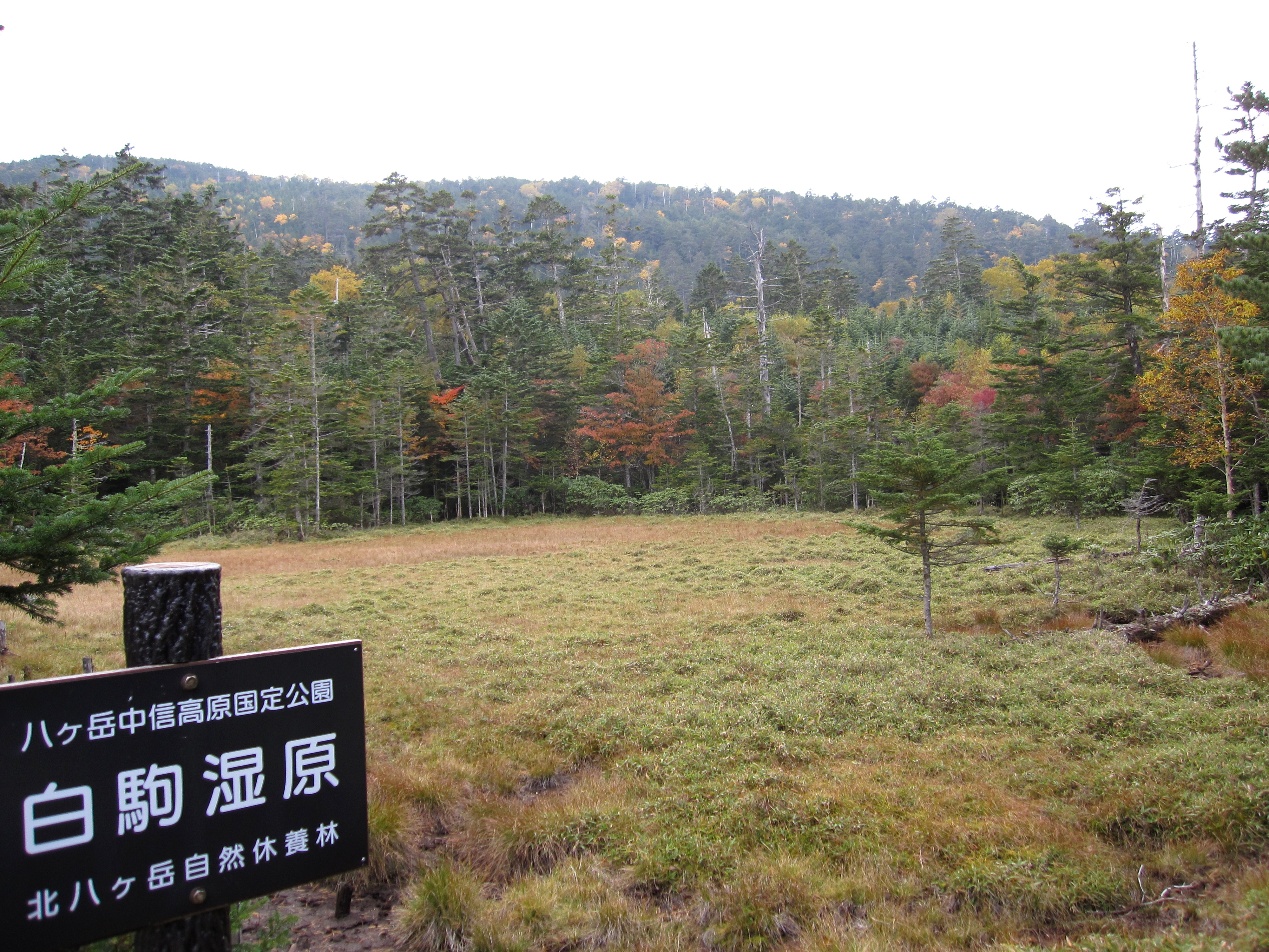 しばらく歩くと、池の東南岸にニュウに入る、左折する道があります。白樺林道と呼ばれる道です。 この道に入って(9:55)、10分程歩くと白駒湿原がありました(下の写真)。