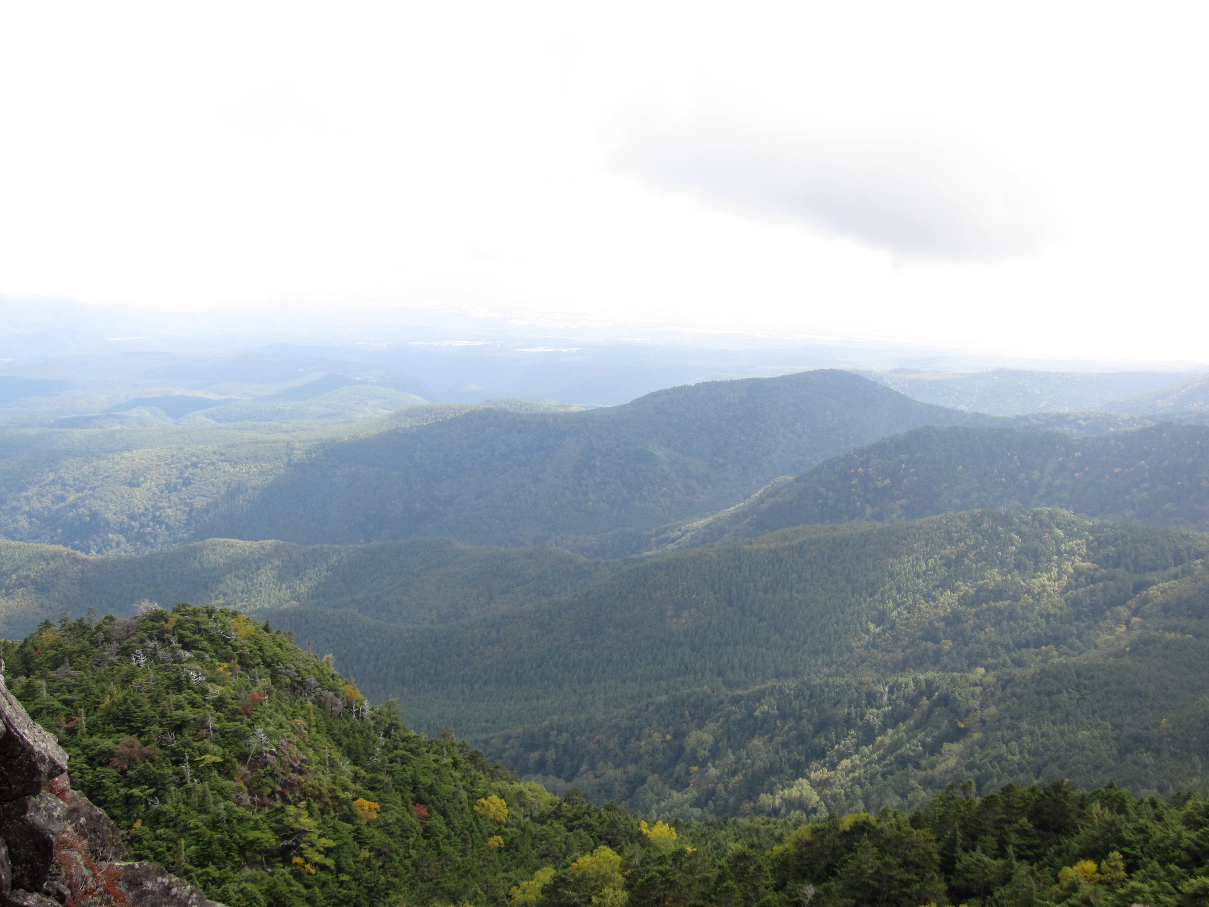 山頂の岩峰の上で、家内の作ってくれたおにぎりを広げて、ゆっくり食べました。色付いた樹海など、絶景を眺めながらのおにぎりは格別おいしく感じました。
