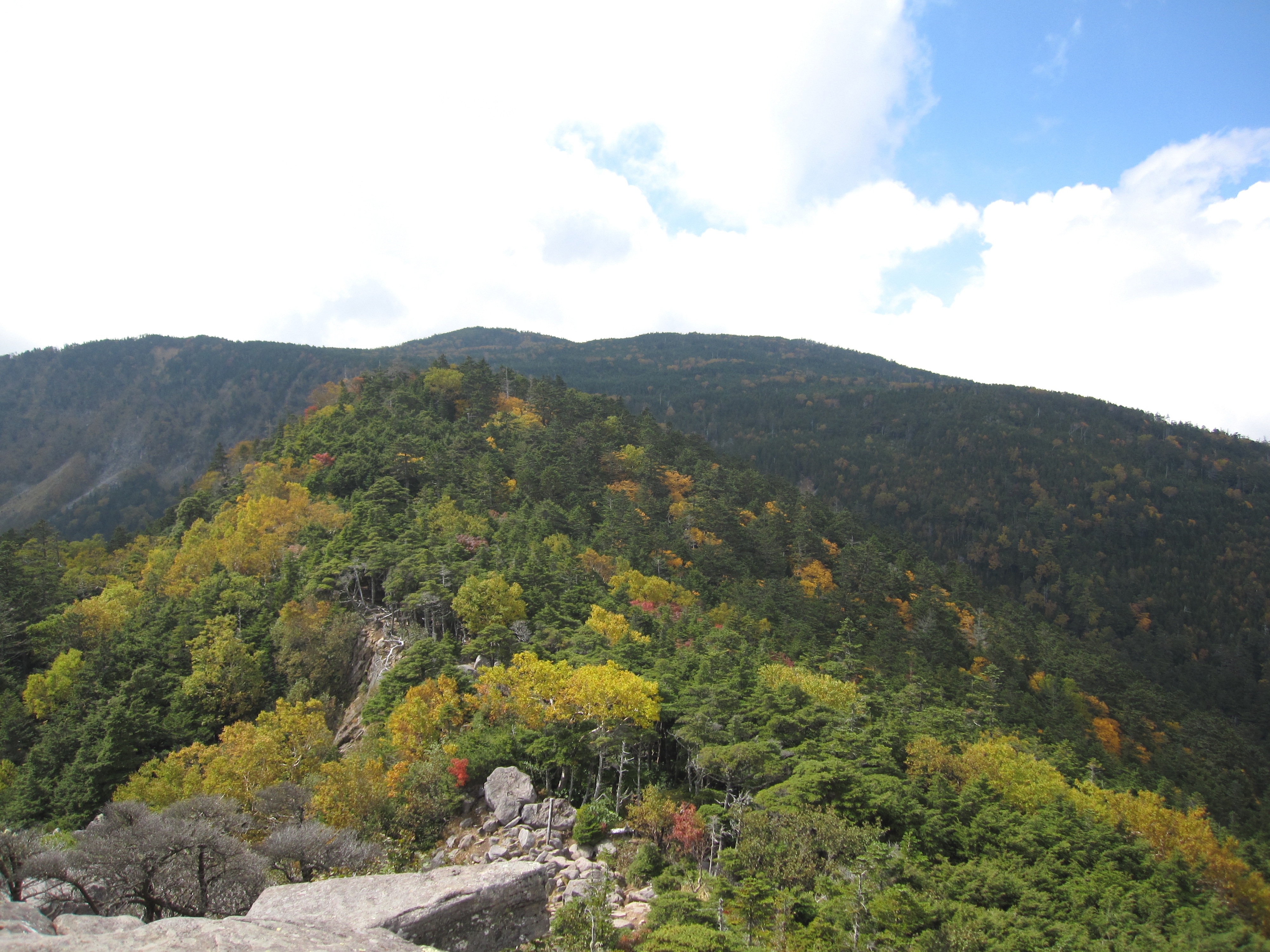 ニュウの岩鋒 の上からは360度パノラマのように眺められました。北西方向には紅葉した樹林の向こうに白駒池が見え、更にその向こうに茶臼山や北横岳などが見えます(上の写真)