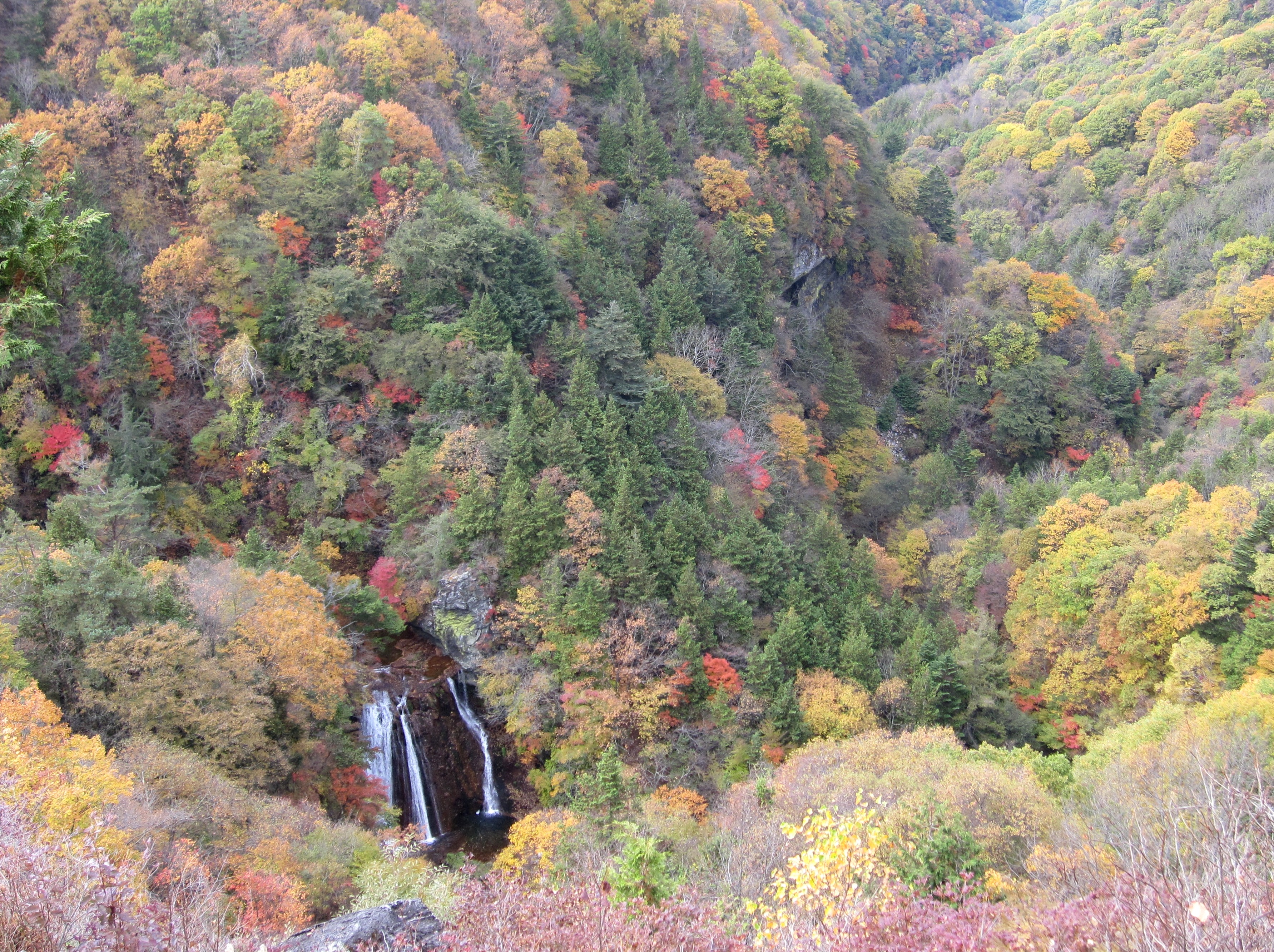 横谷観音展望台から見る横谷峡はちょうど今紅葉が見頃で、王滝の回りもきれいに彩られていました。
