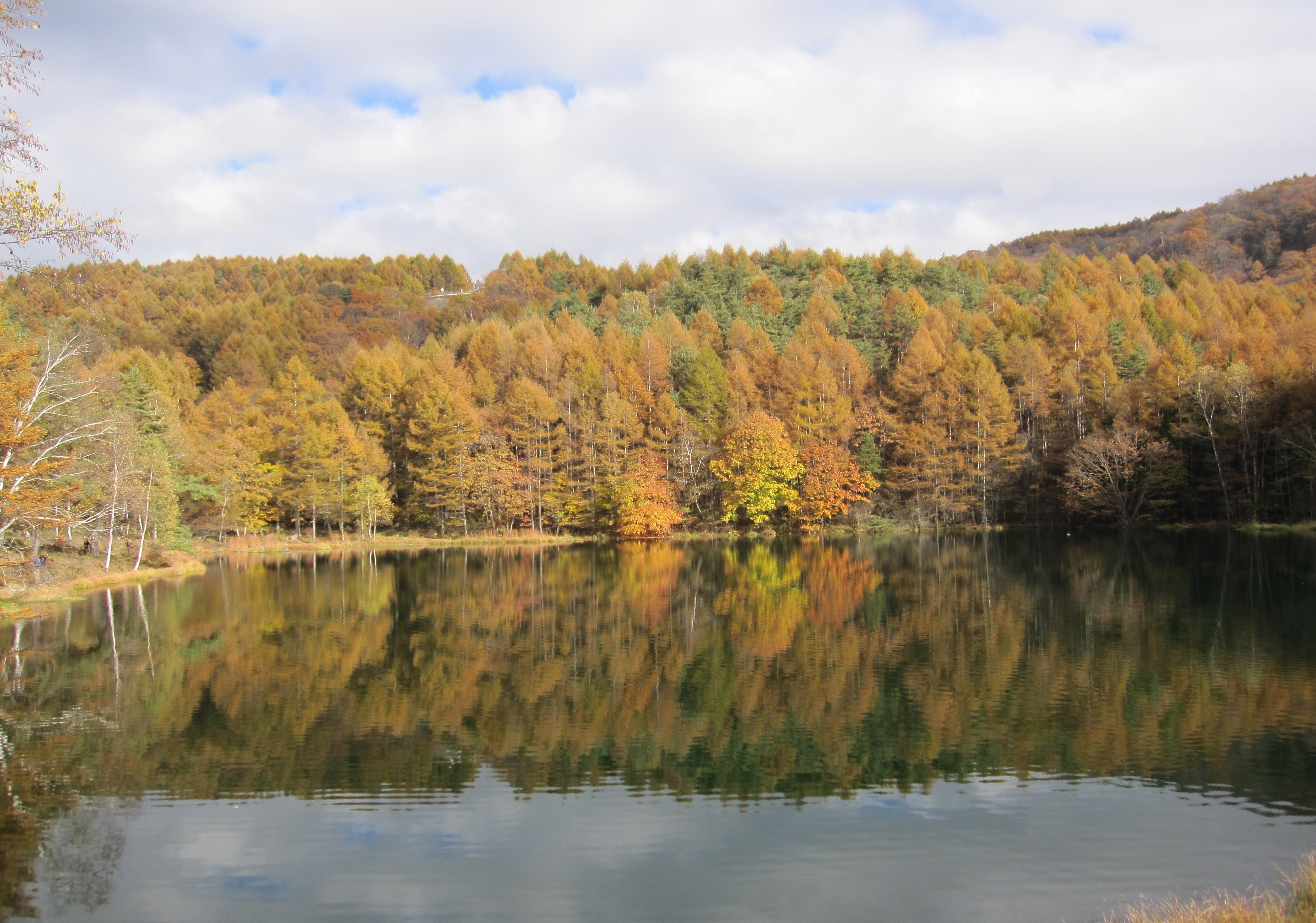 御射鹿池のカラマツは少し散り始めていましたが、黄金色になった木々が水面にきれいに映っていました。