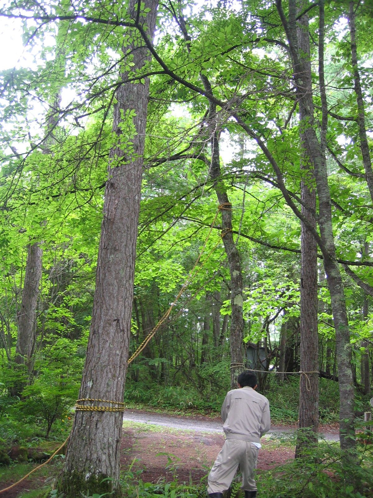 伐採する木は栗の木と山桜の木です。危険な方向に倒れないように木に2本のロープを架けて縛り、3本目のロープは家内に引っ張ってもらうことにしました。